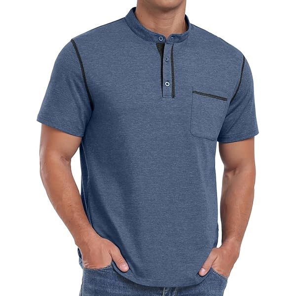 Heathered Blue Short-Sleeve Henley Shirt with Contrast Trim