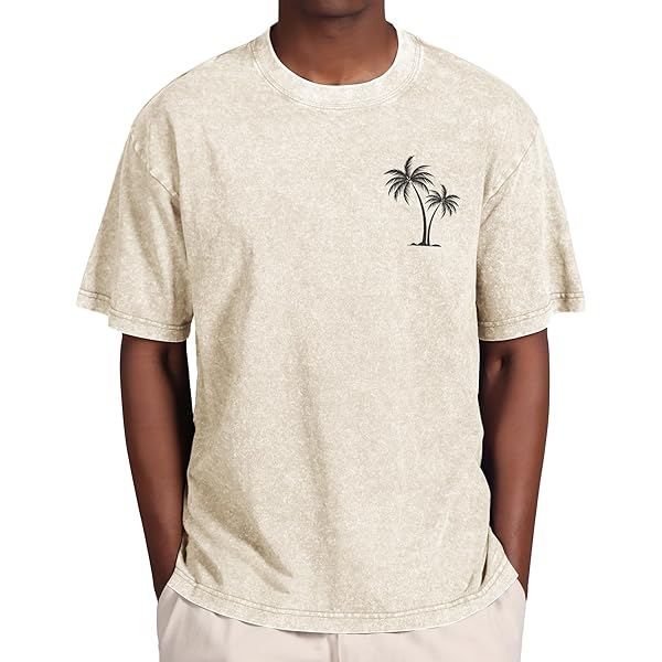 Beige Acid-Wash Short-Sleeve T-Shirt with Palm Tree Graphic
